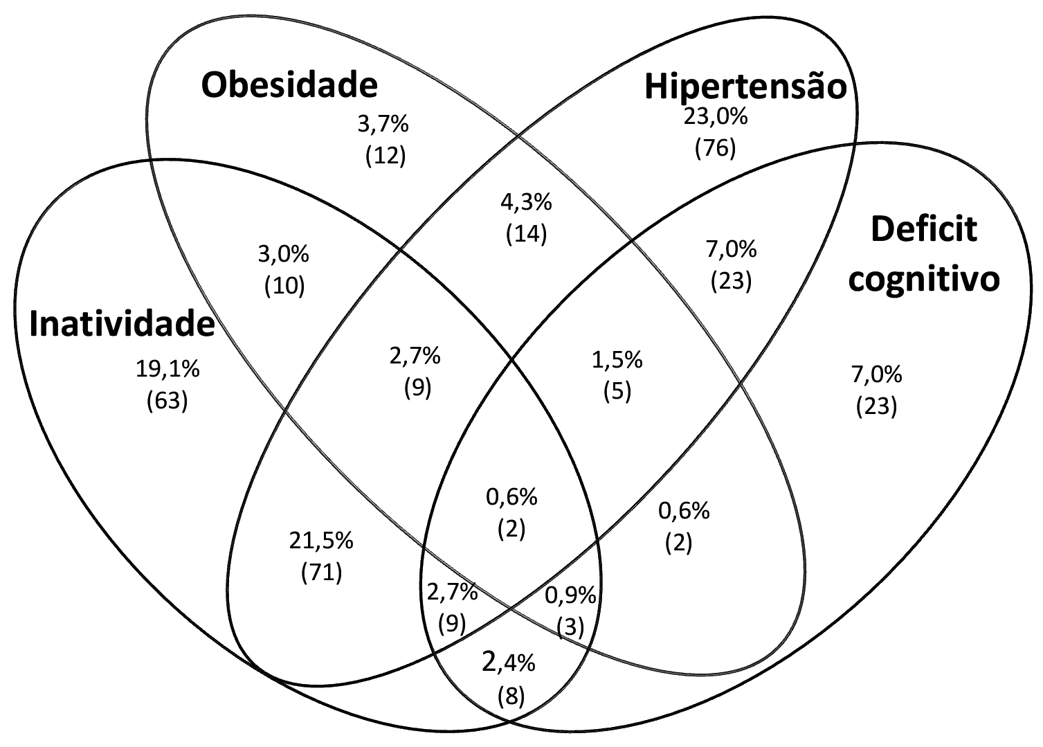 - Menos prevalentes: inatividade física, obesidade, hipertensão e déficit cognitivo (0,6%).